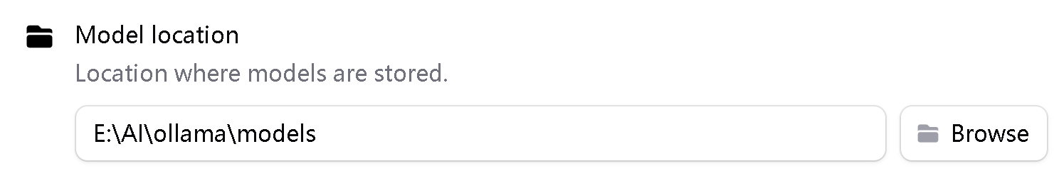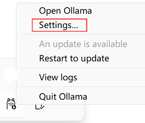 大模型使用 ollama 来安装,比较省心省力,先在 Ollama 下载 安装包,安装无脑一路下一步即可。ollama 默认模型存放在系统盘的用户数据区,如果考虑 C 盘被占满,建议安装完在托盘区右键那个羊驼图标,选择 Settings...,