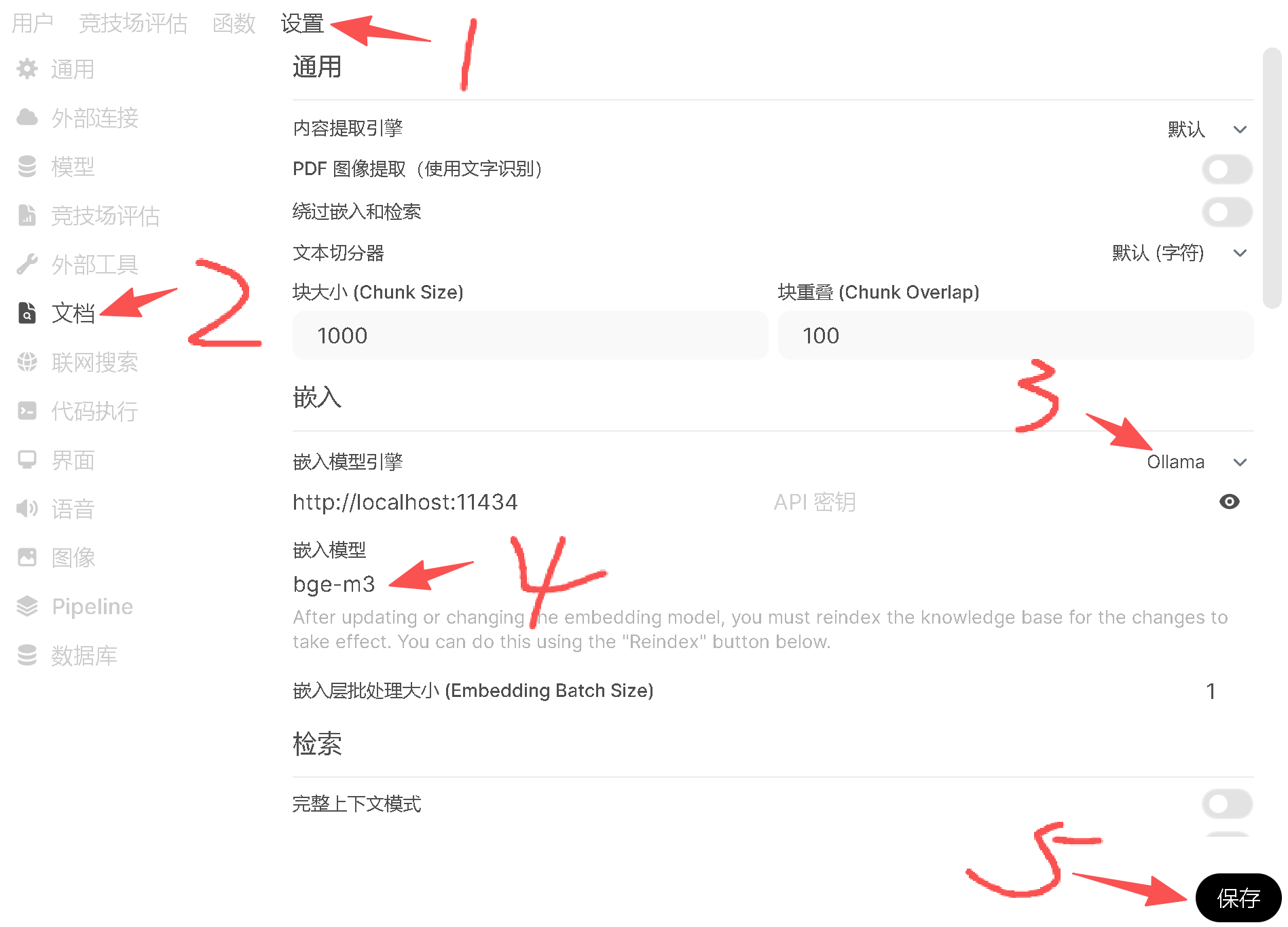 主要操作就是嵌入模型引擎选择 ollama,嵌入模型填写 bge-m3,最后记得点击保存才能生效。