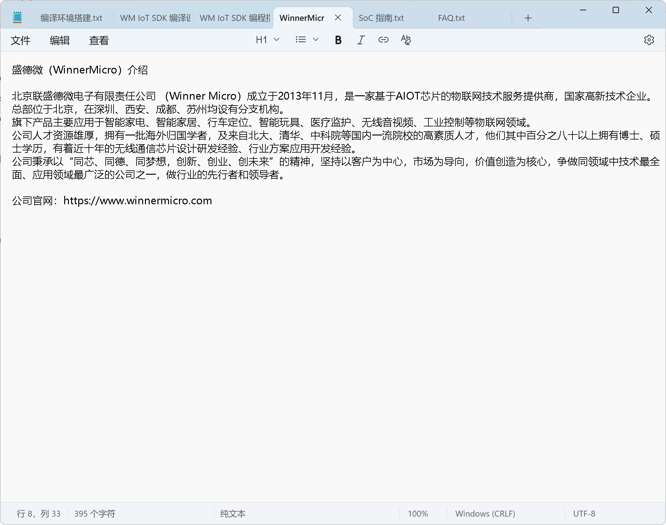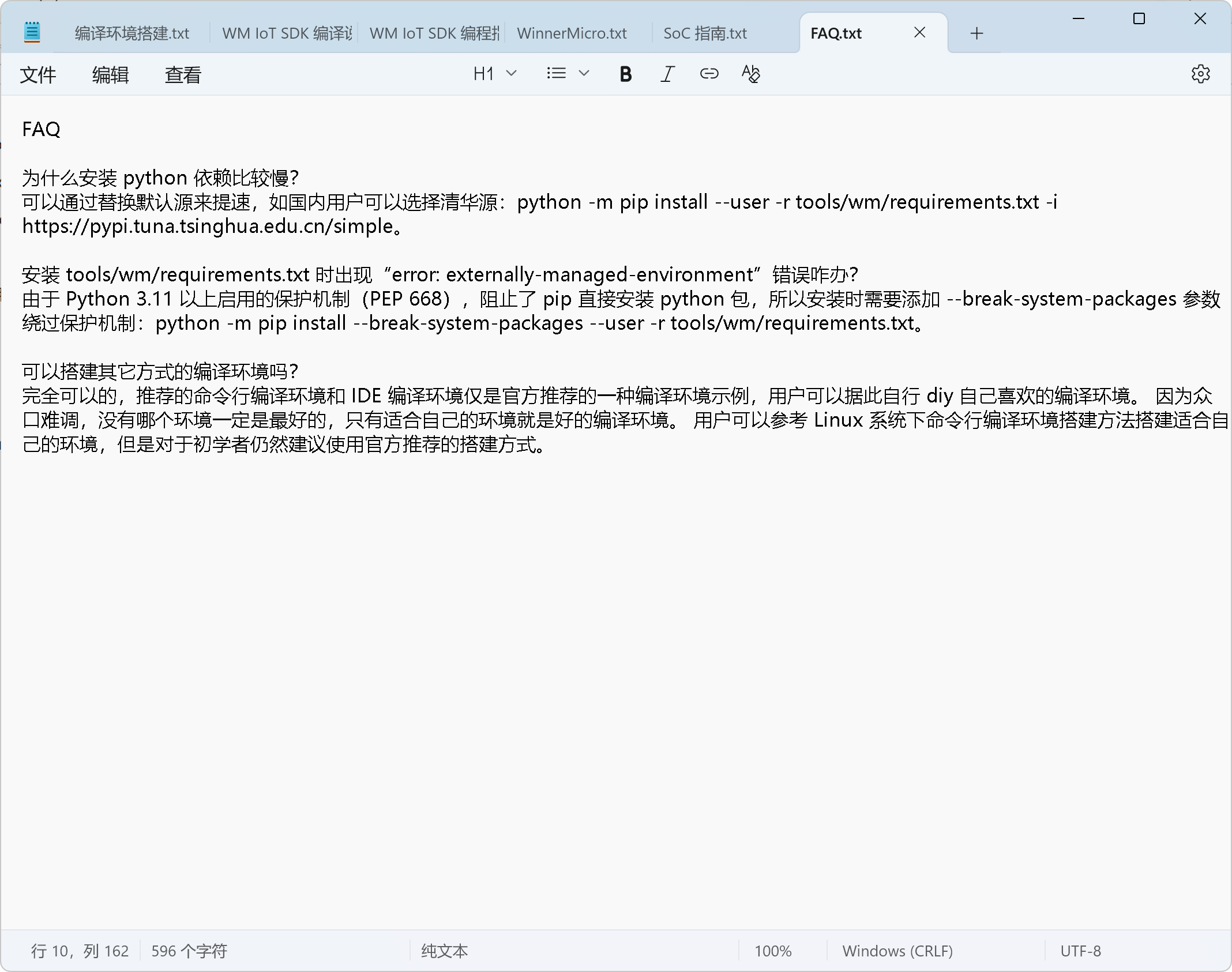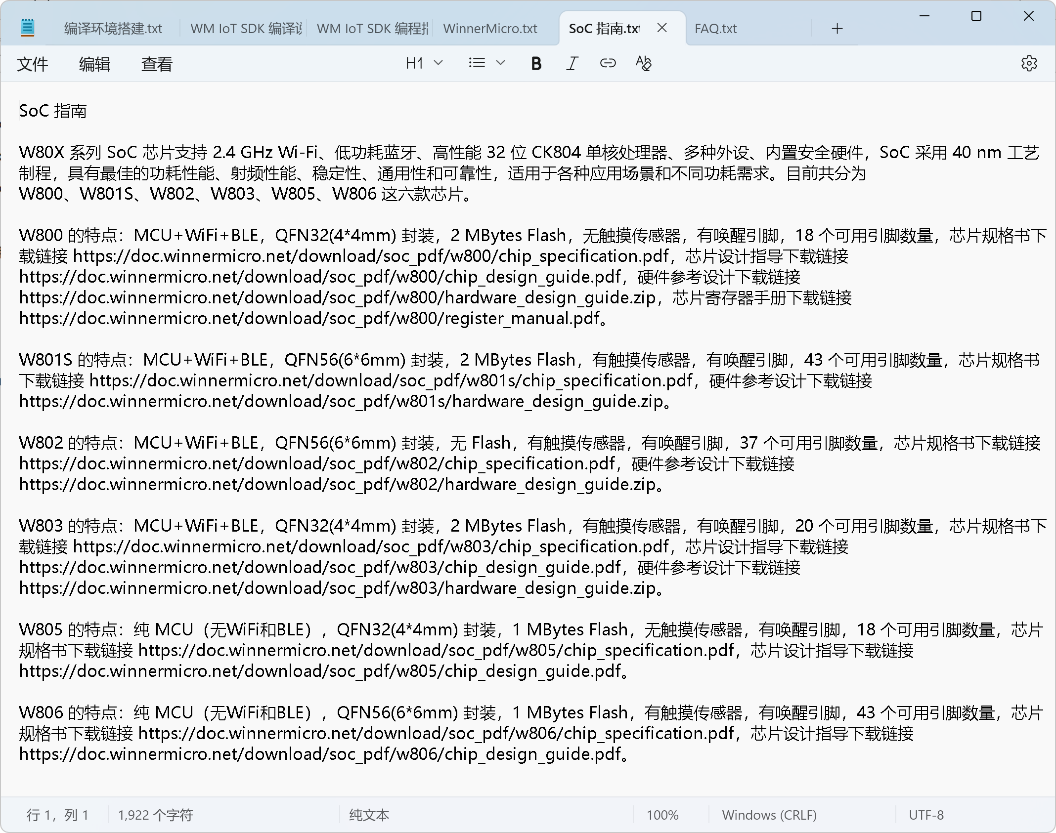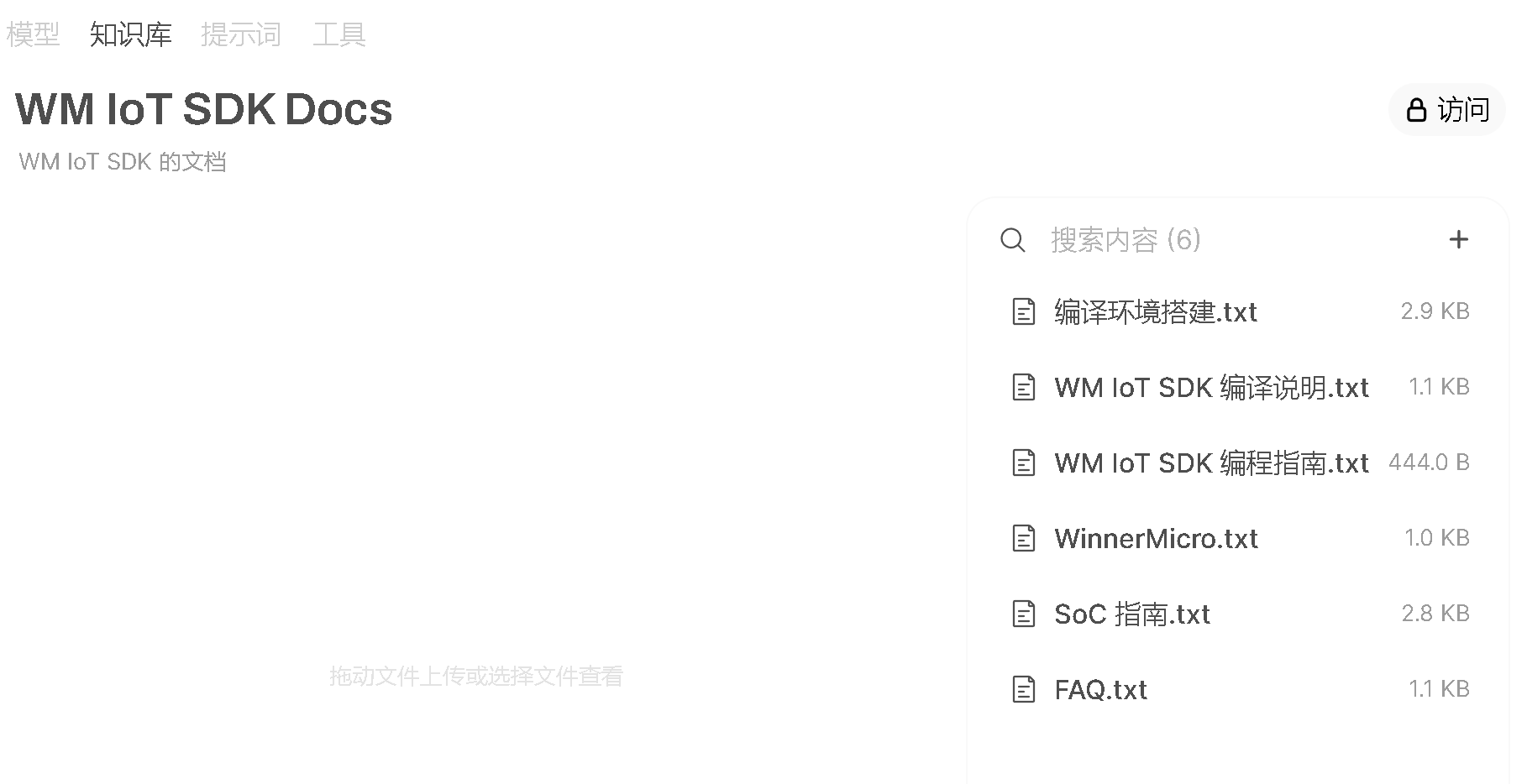 这里的文档我准备使用之前文档提到过的 WM IoT SDK 的使用文档来演示,WM IoT SDK 比较小众,现成的大模型里通常都没有这个东西的已训练数据,所以一般的大模型你去问 WM IoT SDK 相关的问题,基本上是不会得到答案的,所以比较适合拿来做知识库演示。于是我就从 WM IoT SDK 编程指南 这个网站上复制一点信息粘贴成了这样的 6 个 txt 文档: