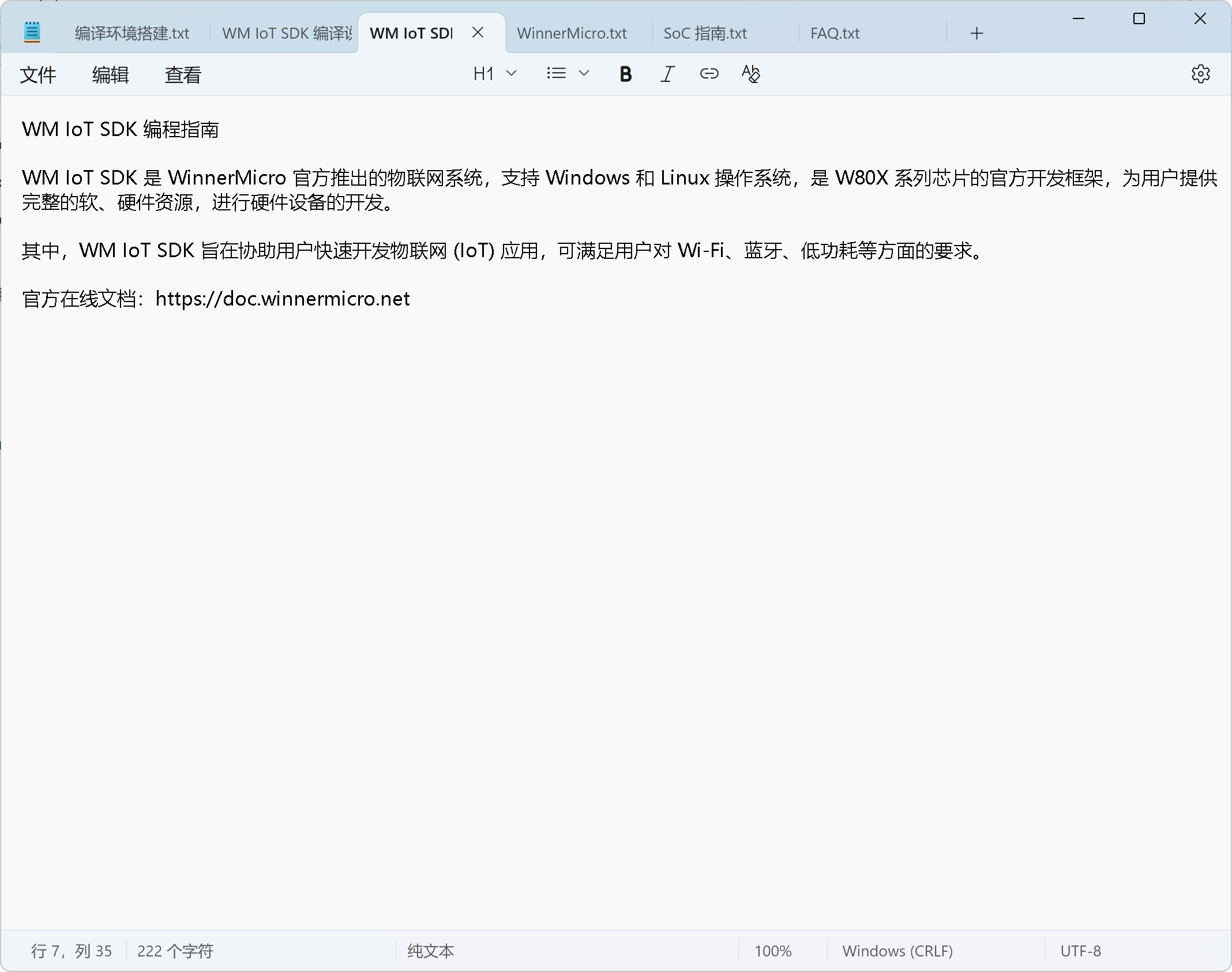 这里的文档我准备使用之前文档提到过的 WM IoT SDK 的使用文档来演示,WM IoT SDK 比较小众,现成的大模型里通常都没有这个东西的已训练数据,所以一般的大模型你去问 WM IoT SDK 相关的问题,基本上是不会得到答案的,所以比较适合拿来做知识库演示。于是我就从 WM IoT SDK 编程指南 这个网站上复制一点信息粘贴成了这样的 6 个 txt 文档: